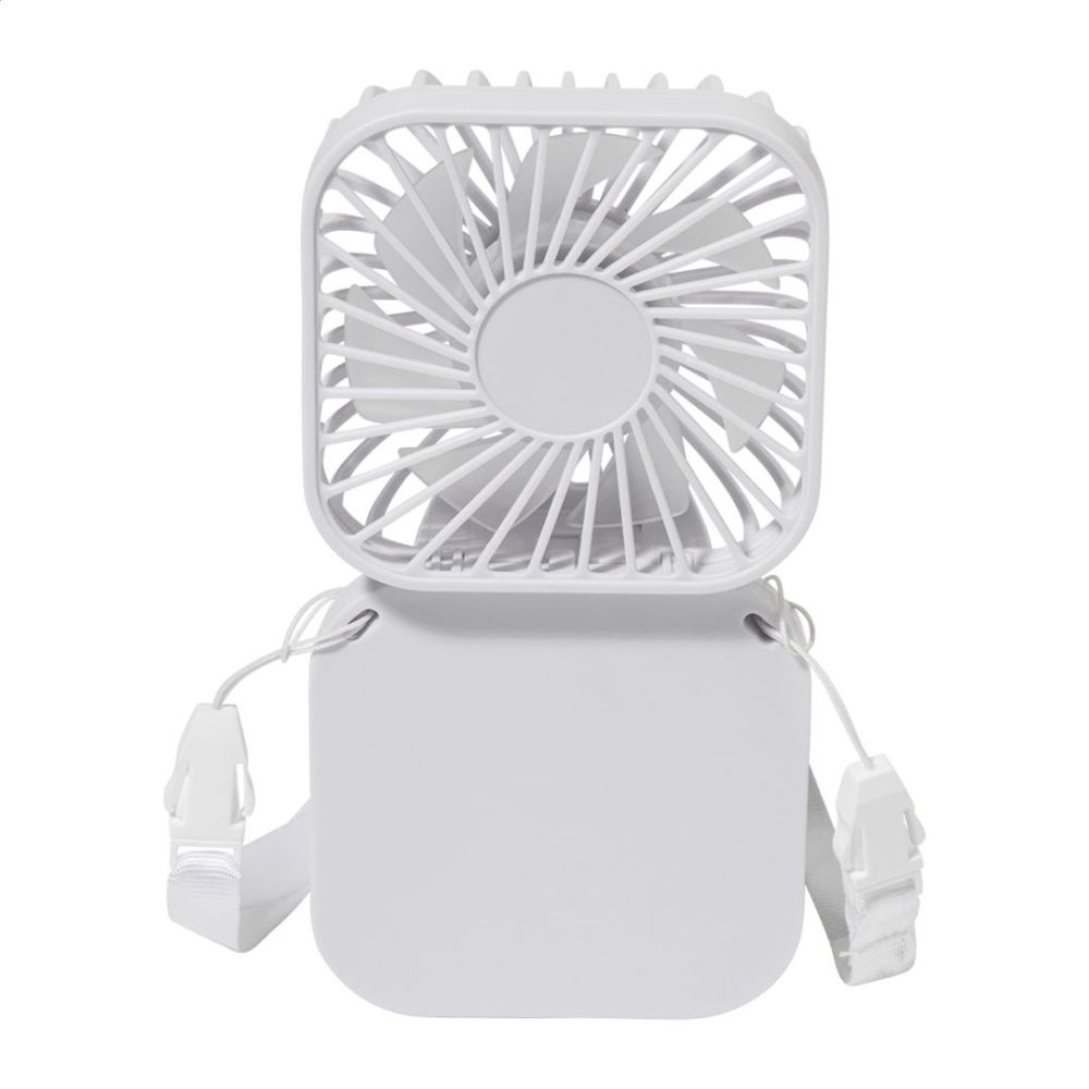 Elektrický ručný vetráčik z recyklovaného ABS plastu s pútkom na krk a vstavanou dobíjacou batériou cez USB (500 mAh). S nastaviteľným uhlom hlavy a 3 rýchlosťami. Vrátane USB kábla na nabíjanie.