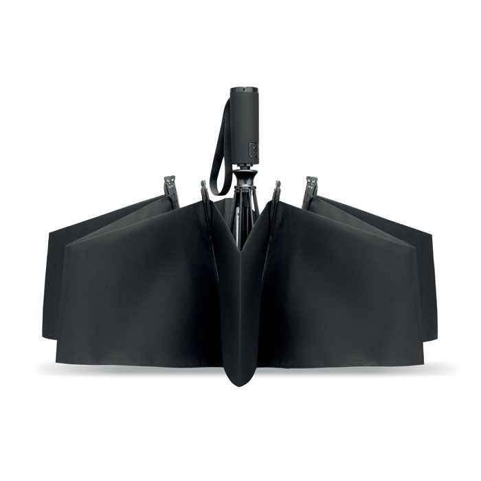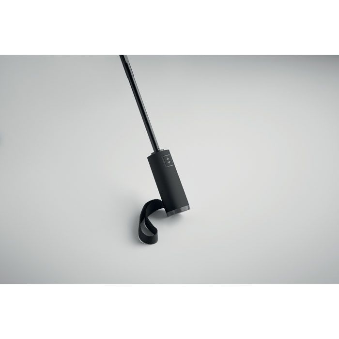 23palcový skládací větruodolný deštník ze 190T RPET pongee v obalu. Automatické otevírání a zavírání. Černá pokovená tyč, žebra ze sklolaminátu a rukojeť z ABS s gumovou povrchovou úpravou.