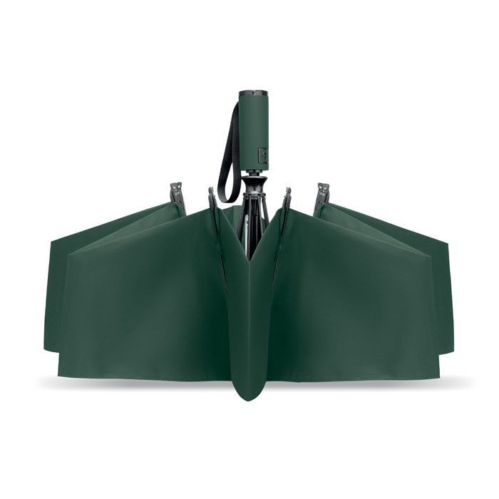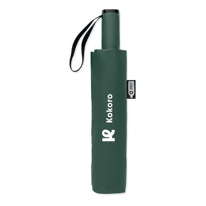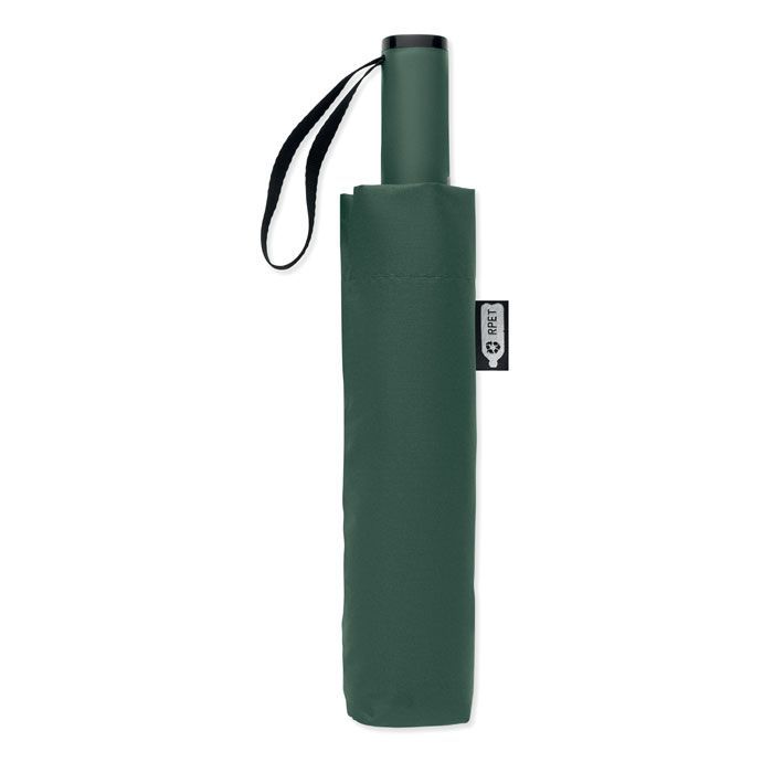 23palcový skládací větruodolný deštník ze 190T RPET pongee v obalu. Automatické otevírání a zavírání. Černá pokovená tyč, žebra ze sklolaminátu a rukojeť z ABS s gumovou povrchovou úpravou.