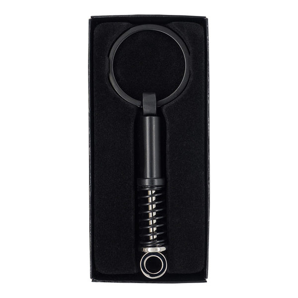 Kovový přívěsek ve tvaru tlumiče z černého kovu s viditelným pružinovým mechanismem. Baleno v černé dárkové krabičce z kartonu.