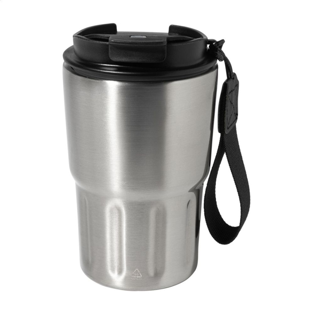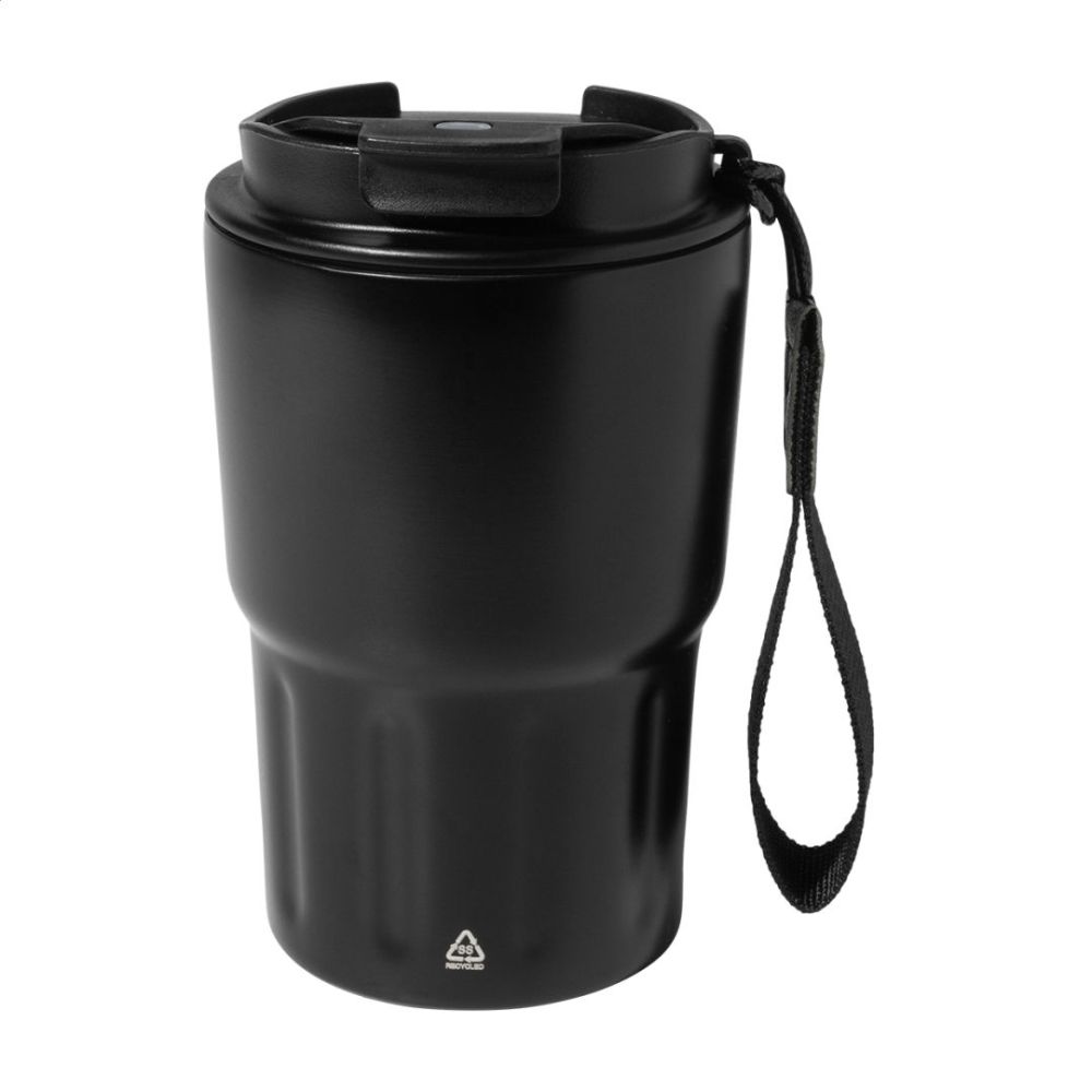 Dvojstenný termo hrnček z recyklovanej nerezovej ocele s izolačným viečkom z PP. S pútkom z RPET polyesteru. 350 ml.