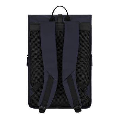 Designed with form as much as function in mind, this casual-inspired rolled-top backpack is rendered in a deep navy tone, elevated by elegant black matte details. A subtle utilitarian aesthetic is expressed through its rolled-top closing construction, perfectly finished with an integrated magnetic closure engraved with the RR signature. The silhouette is light and roamy, ideal for daily movement. Two flat zipped pockets to the front provide practical organization, while the interior features a dedicated laptop compartment for everyday essentials. A padded back panel and padded shoulder straps ensure lasting comfort in use. Inside, a spacious roamy interior reveals a refined monogram lining, completed with a zipped inner pocket for secure storage. It is the perfect accessory for someone with a minimalist yet casual and modern aesthetic.