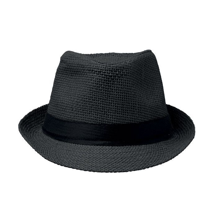 Papírový slaměný klobouk s černým polyesterovým páskem. U objednávek bez potisku se páska dodává nepřipevněná ke klobouku.