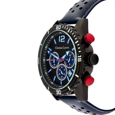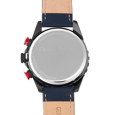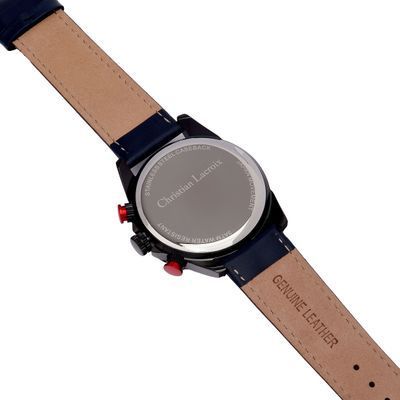 Introducing the "SOL" watch by Christian Lacroix, tailored for a casual and active lifestyle. This version boasts a vibrant blue genuine leather bracelet paired with a sleek black case and dial. The black bezel and unexpected red buttons add a touch of flair. Available in both chrono and dater versions, the "SOL" watch effortlessly blends style with functionality. With the same brand's commitment to quality, this timepiece is designed for those who seek a perfect balance of fashion and performance. Elevate your wrist presence with the dynamic charm of the "SOL" watch by Christian Lacroix.
