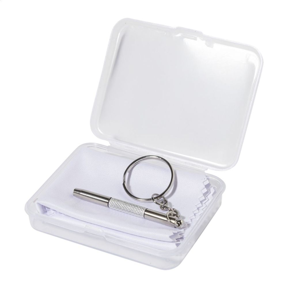 Kompaktná sada na opravu okuliarov v priehľadnej PP krabičke. Vrátane čistiacej handričky zo 100% RPET mikrovlákna (220 g/m²) a mini skrutkovača s kľúčenkou. Rozmer handričky: 18×15 cm.