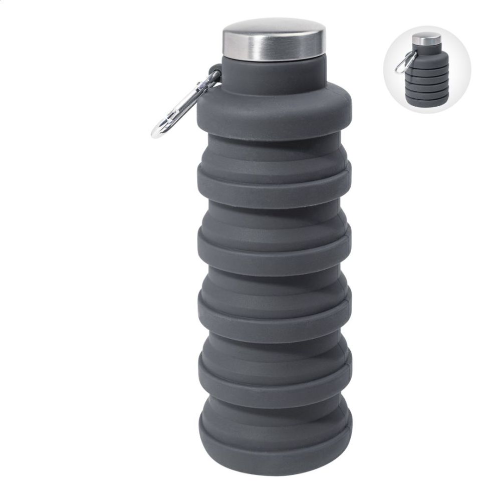 Skladacia silikónová fľaša s viečkom z nerezovej ocele a hliníkovou karabínou. 500 ml