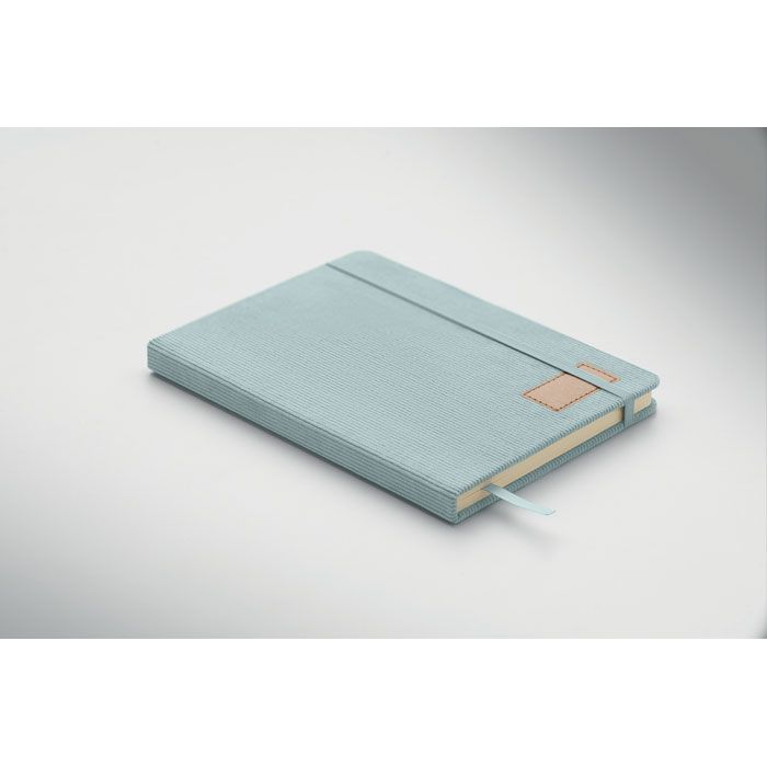 Zápisník A5 s tvrdými deskami potaženými polyesterovým RPET manšestrem. 192 linkovaných stránek z recyklovaného 70g papíru. Zavírání na gumičku, poutko na pero, záložka a etiketa z kraftového papíru.