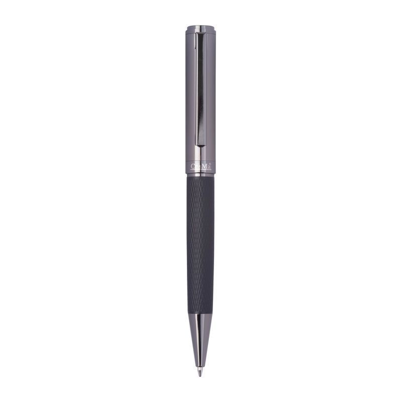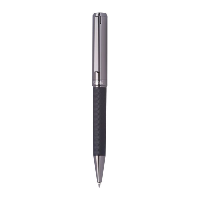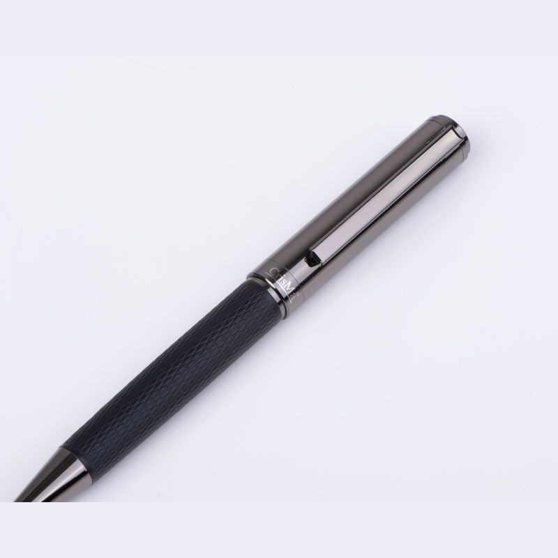 CrisMa kovové guľôčkové pero s vzorovanou úchopovou časťou, modrou náplňou a dĺžkou písania približne 1 200 metrov – s malým logom CrisMa pod klipom. Zabalené v krabičke s magnetickým uzáverom.
