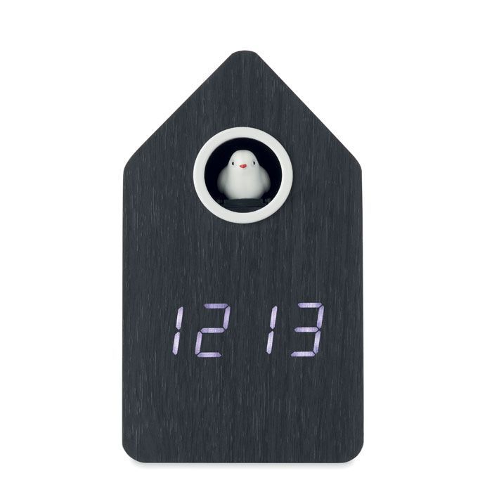 Kukačkové hodiny z MDF s vestavěným budíkem/ukazatelem teploty. Ptáček vykoukne a kuká každou celou hodinu a také během budíku. Bílý LED displej. Zvuk se automaticky ztlumí mezi 22:00 a 6:00.