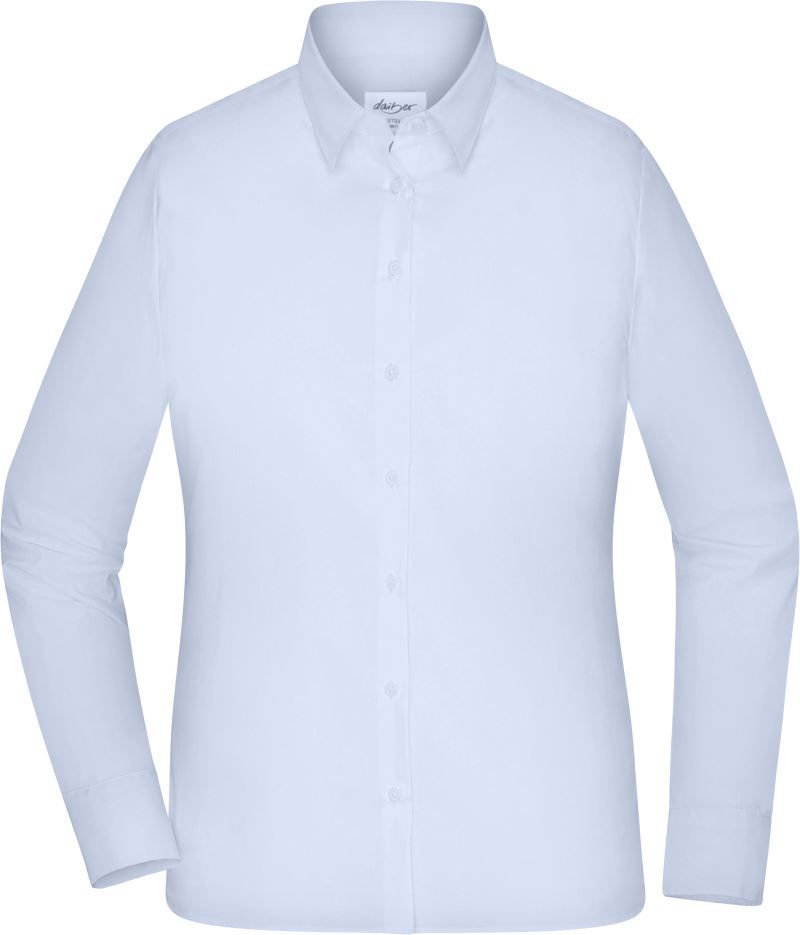 Lehce vypasovaný střih, malý měkký límec, dvouvrstvé sedlo na ramennou a zádech, zaoblený lem, knoflíky tón v tónu, pratelné na 30°, Easy Care, šetrné praní, nelze sušit v sušičce