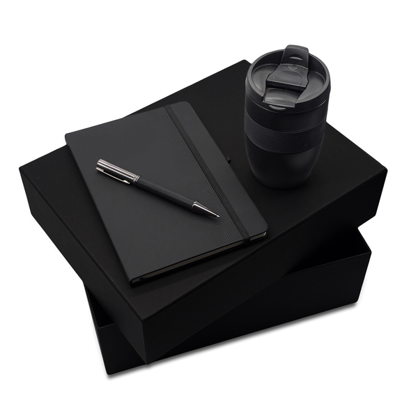 Dárková sada se zápisníkem A5, kovovým kuličkovým perem s modrou náplní a termohrnkem. Zápisník v pevné vazbě z PU, 80 čtverečkovaných listů (70 g/m2). Termohrnek o objemu 300 ml s dvojitou stěnou z nerezové oceli, vnitřní stěnou z vylepšené oceli 18/8 a objímkou ze silikonu. Termoizolační schopnost 5 h. Jen ruční mytí.