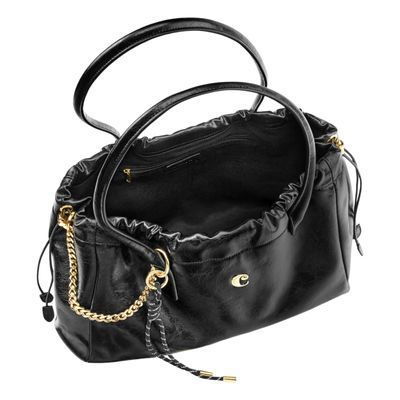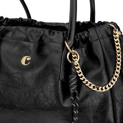 The Philomene tote bag embodies refined sophistication with a confident, fashion-forward edge. Made from a glazed, crinkled leather-like texture, it is signed with the signature Cacharel C plate, enhanced by elegant gold trims, and subtly embossed with the Cacharel logo. The material is soft, supple, and exudes a sense of luxury. Designed in a generous format, the tote offers a spacious and well-structured interior, ideal for everyday organization. It features a PU cord detail around the opening, giving it a modern pouch-like silhouette, and is adorned with a removable decorative cord-and-chain charm that adds a distinctive touch of style.It also features push closing that allow to thigten the closing. The perfect chic and feminine work bag, combining practicality and elegance in equal measure. Available in black