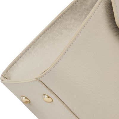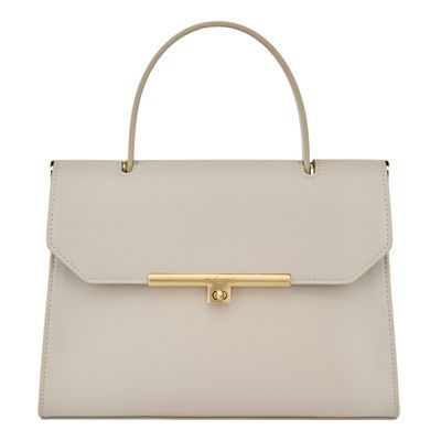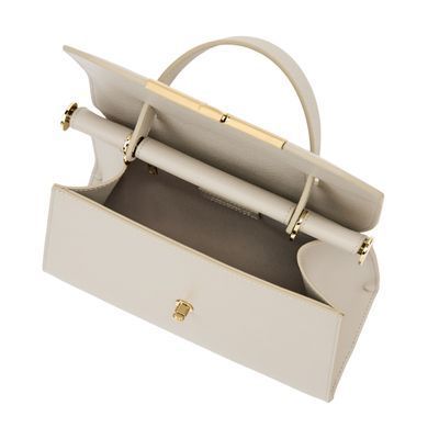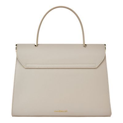 The Seraphine large bag exudes timeless sophistication with its structured and luxurious silhouette. Crafted from saffiano-textured vegan leather, it is signed with an exclusive gold turn-lock closure engraved with the Cacharel logo, embodying refined minimalism. Its elegant top handle enhances its polished character, while all gold trims add a feminine and elevated accent. A discreet gold TPU logo on the back completes the signature details. Designed to balance style and functionality, the spacious interior includes a zipped compartment for everyday organization. Available in taupe, light grey, and black.