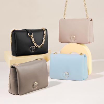 The "Vivienne" small bag in light blue offers a fresh and captivating charm. Crafted from soft matte vegan leather (PU) with a padded effect, its vibrant yet delicate hue is beautifully complemented by gold trims. The gold "C" logo plate with a light blue ABS finish adds a cohesive and polished element. Designed as a crossbody bag, it features a strap made of PU and metal chain, adjustable in length for personalized wear. With its compact and functional design, this bag is a statement piece that enhances any outfit with a touch of elegance.