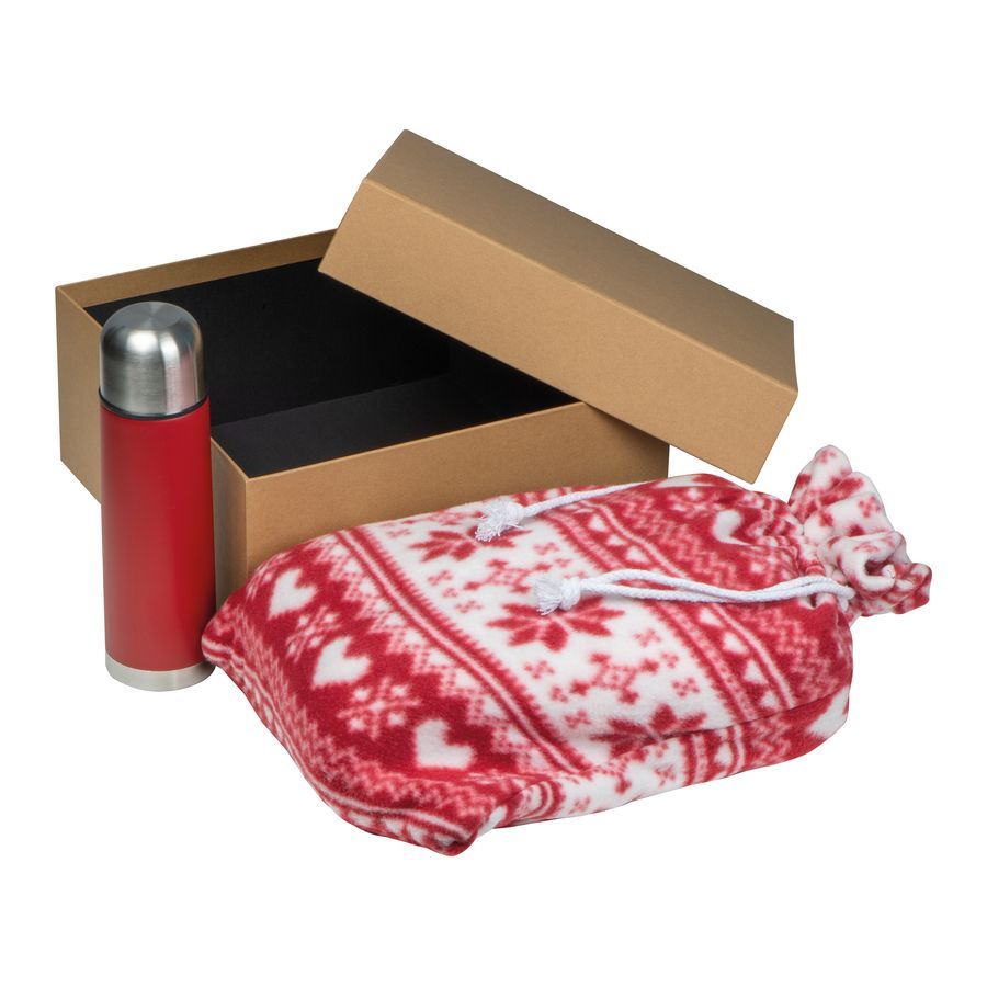 Darčeková súprava pozostávajúca zo zimnej flisovej deky (130 x 170 cm) a kovovej vákuovej termosky (500 ml).