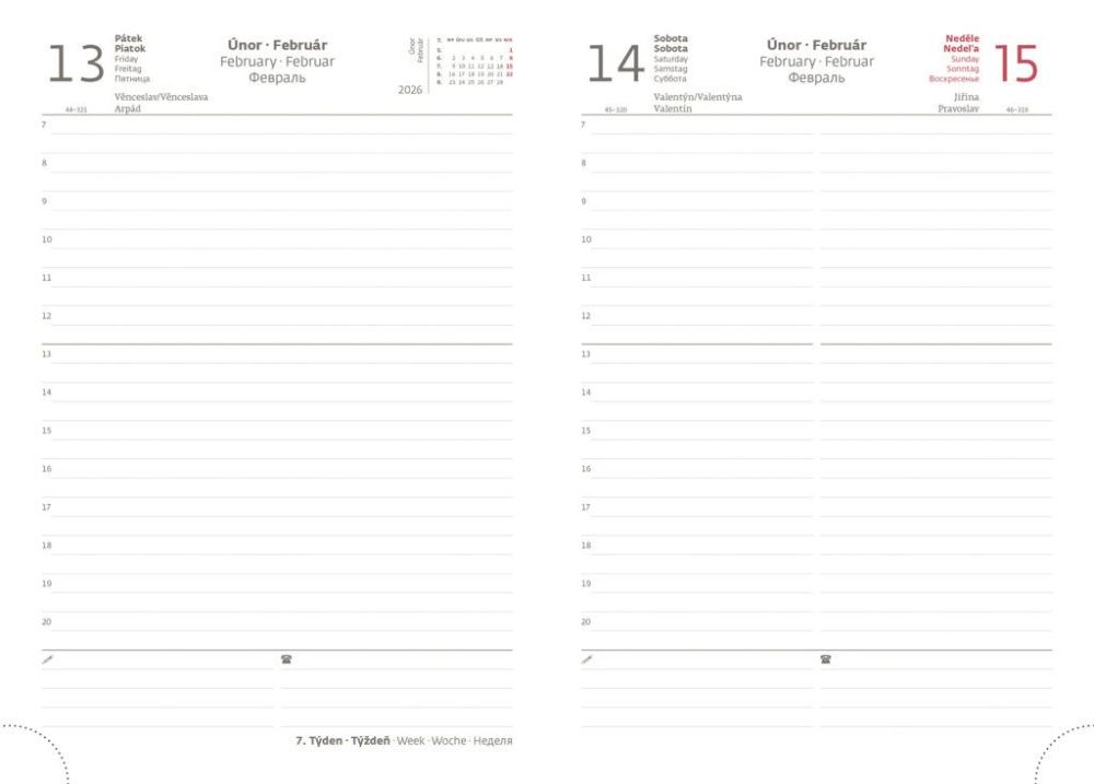 Diár obsahuje: osobné údaje, plánovač dovolenky (mesačný prehľad), plánovací kalendár, telefónne predvoľby, štátne sviatky Českej a Slovenskej republiky, medzinárodné sviatky, ročný výhľad, denný layout, adresár, mapa Európy a Českej a Slovenskej republiky
