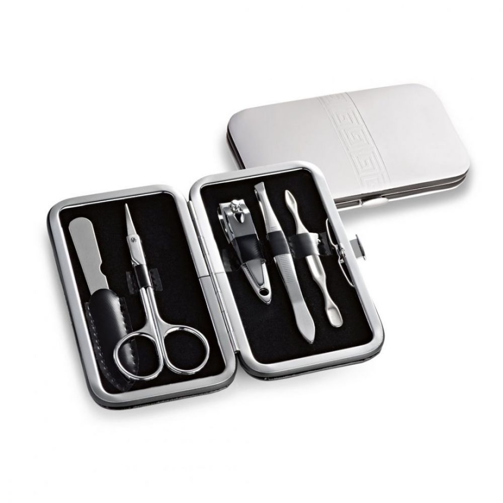 Päťdielna súprava na manikúru s pilníkom, nožnicami, klieštikmi, pinzetou a nástrojom na zatláčanie kožičky nechtov. Dodávané v puzdre z imitácie kože