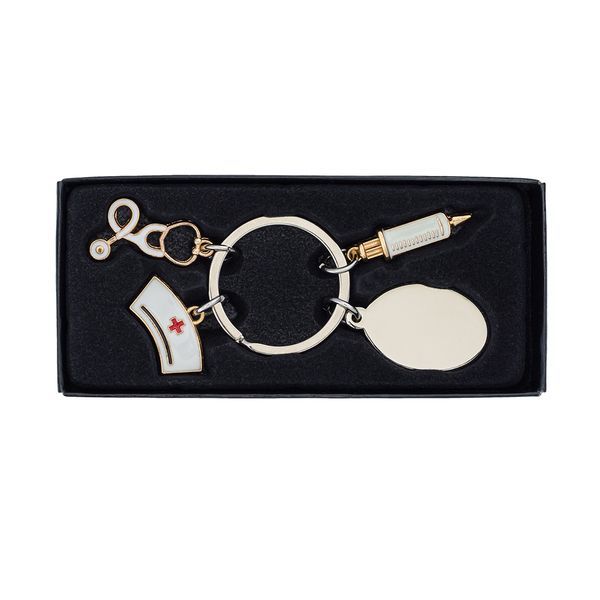 Kovový přívěsek s tématikou zdravotnictví. Obsahuje 4 přívěsky: čepec zdravotní sestry, stetoskop, injekční stříkačku a přívěsek pro gravírování Vašeho loga. Baleno v černé dárkové krabičce.
