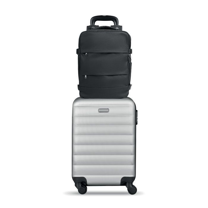 Rozšiřitelný kabinový batoh z polyesteru 600D RPET s PU zátěrem a otevíráním pod úhlem 180. Prostor na boty, polstrovaná kapsa na 15'' notebook, síťované popruhy, popruh na zavazadla a boční přezky.