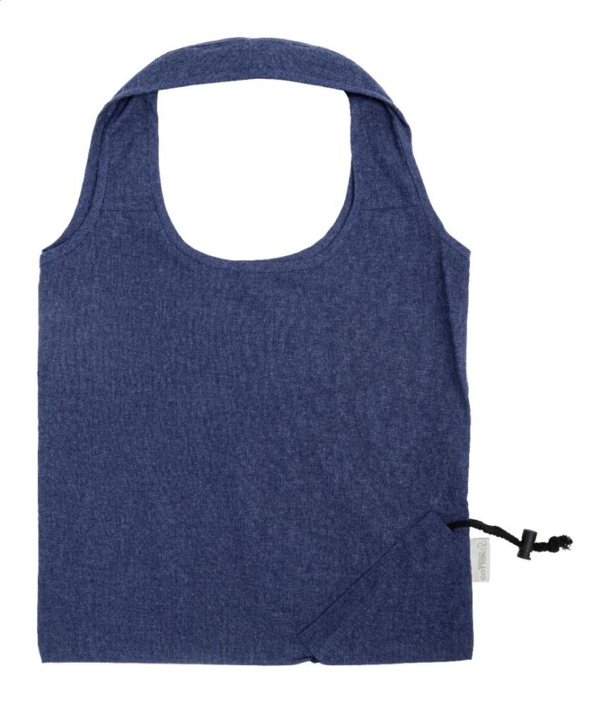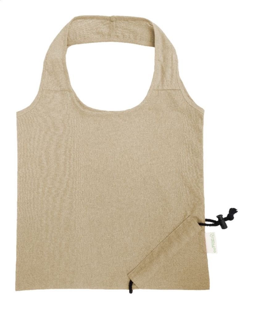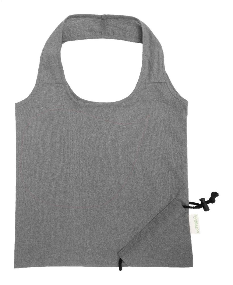 Skladacia nákupná taška zo 70% recyklovanej bavlny a 30% polyesteru RPET, 140 g/m². S výrazným štítkom z recyklovanej bavlny.