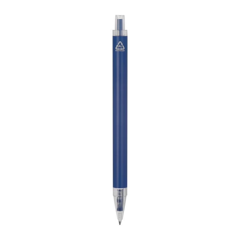 Guľôčkové pero vyrobené z recyklovaného hliníka a plastu (RPET) s priehľadným klipom a modrou atramentovou náplňou.