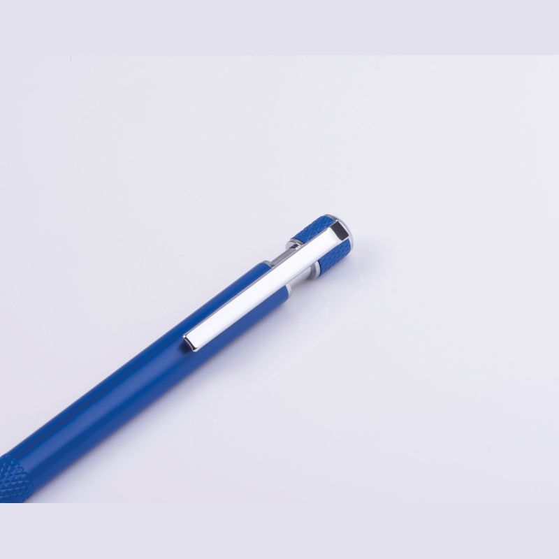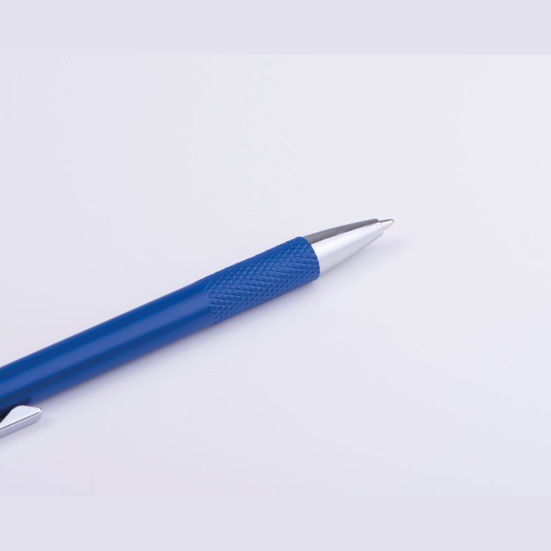 Guľôčkové pero vyrobené z recyklovaného hliníka so vzorovaným úchopom, tlačidlovým mechanizmom a modrou náplňou.