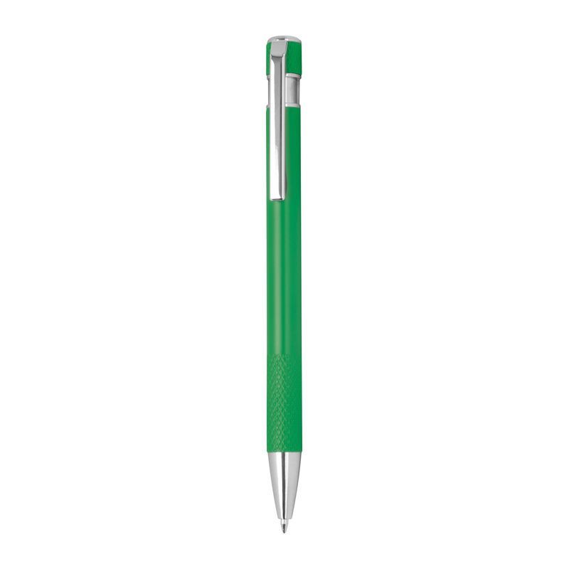 Guľôčkové pero vyrobené z recyklovaného hliníka so vzorovaným úchopom, tlačidlovým mechanizmom a modrou náplňou.