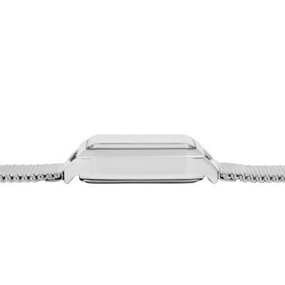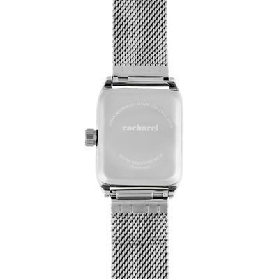 The Philomène watch in silver features a refined Milanese mesh bracelet paired with a crisp silver case, creating a sleek and timeless silhouette. Its mother-of-pearl dial is detailed entirely in silver, with a single stone adding a subtle hint of light. With its perfectly proportioned angular case, it offers an elegant and enduring sense of style.
