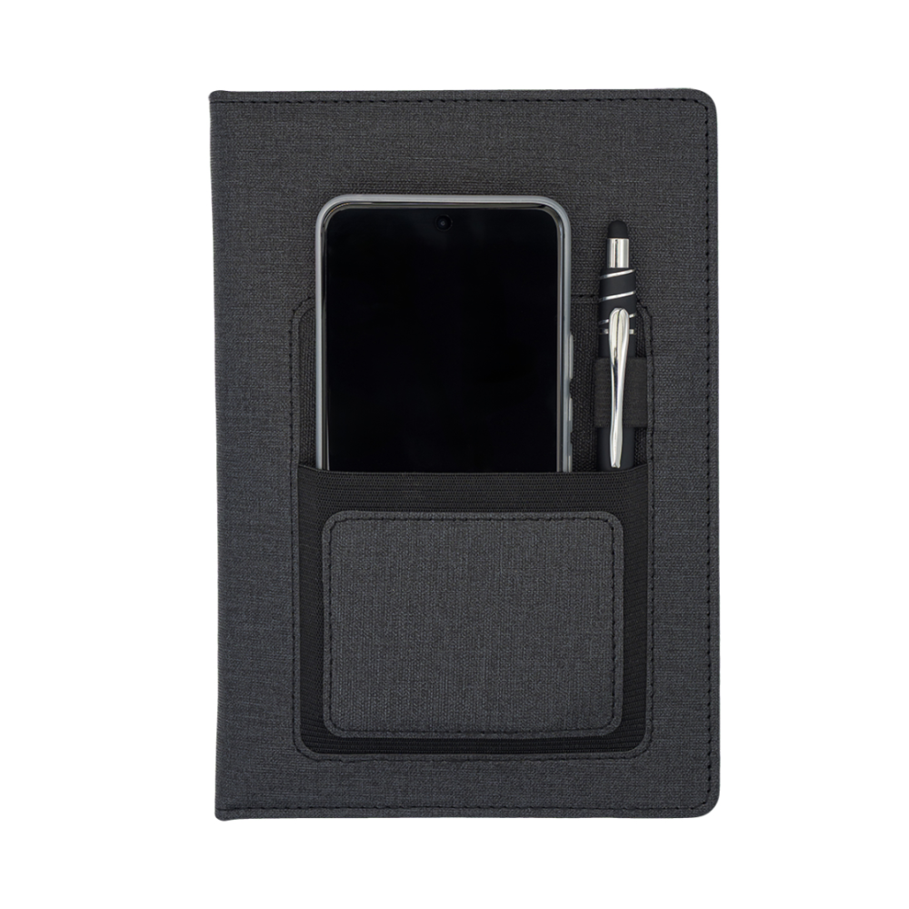 Zápisník A5 v pevné vazbě s elastickou kapsou na mobilní telefon a poutkem na pero. 80 listů linkovaného papíru (80 g/m2).
