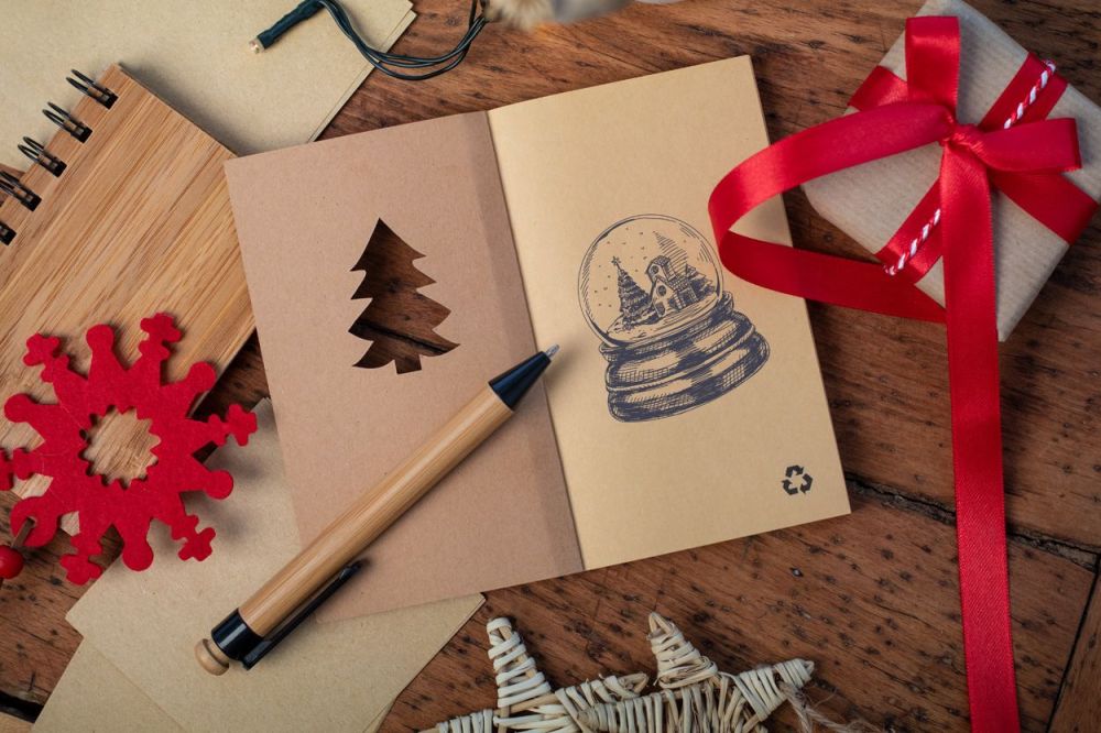 Podložka pokrytá recyklovaným papierom s vyrezaným vianočným stromčekom na obale a 85 prázdnymi listami recyklovaného kraftového papiera.