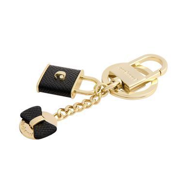 The Seraphine keyring is a feminine and dainty accessory featuring two pendants: a bow and a lock adorned with a 3D Cacharel “C” logo. Both elements combine saffiano-textured vegan leather with refined gold-plated accents. Designed to be used as a keychain or as a decorative charm for a bag. Available in gold & black or gold & light grey.