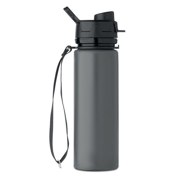 Skládací silikonová sportovní láhev s PP víčkem, rukojetí, polyesterovým popruhem a průhlednou sponou pro zajištění ve složeném stavu. Objem: 500 ml.