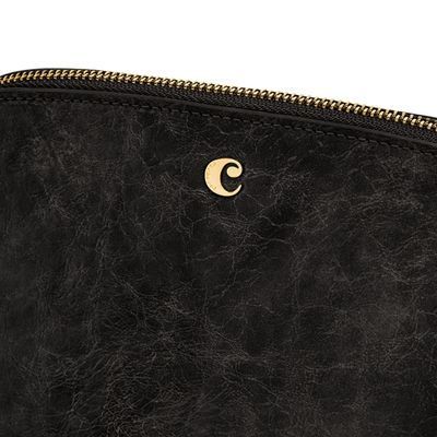 The Philomene cosmetic pouch combines elegance with a bold, contemporary attitude. Crafted from a glazed, crinkled leather-like texture, it is signed with the signature Cacharel C plate and refined gold trims, creating a look that feels both modern and sophisticated. Its roomy shape allows for generous storage, making it ideal for carrying a wide selection of beauty or travel essentials. The design is completed with a distinctive cord zipper puller for a fashion-forward touch and a small Cacharel PU tag inside as a subtle signature detail. Available in black, camel, and burgundy.