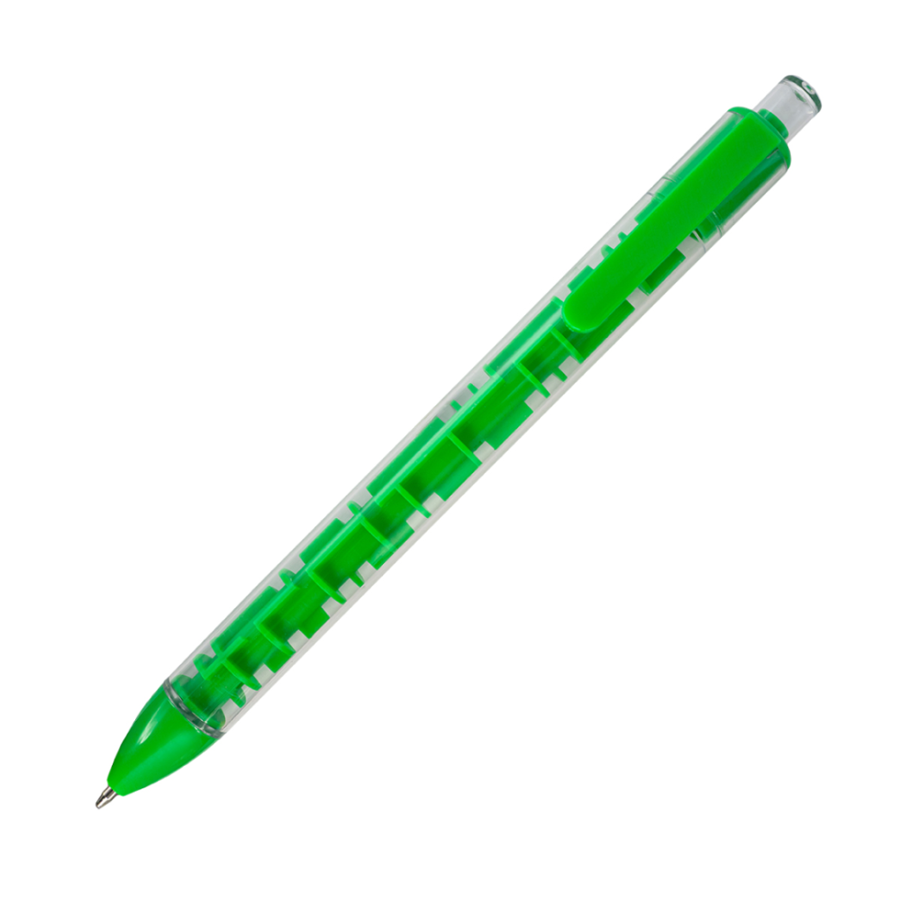 Kuličkové pero z plastu s průhledným tělem a vestavěným bludištěm. Modrá náplň.