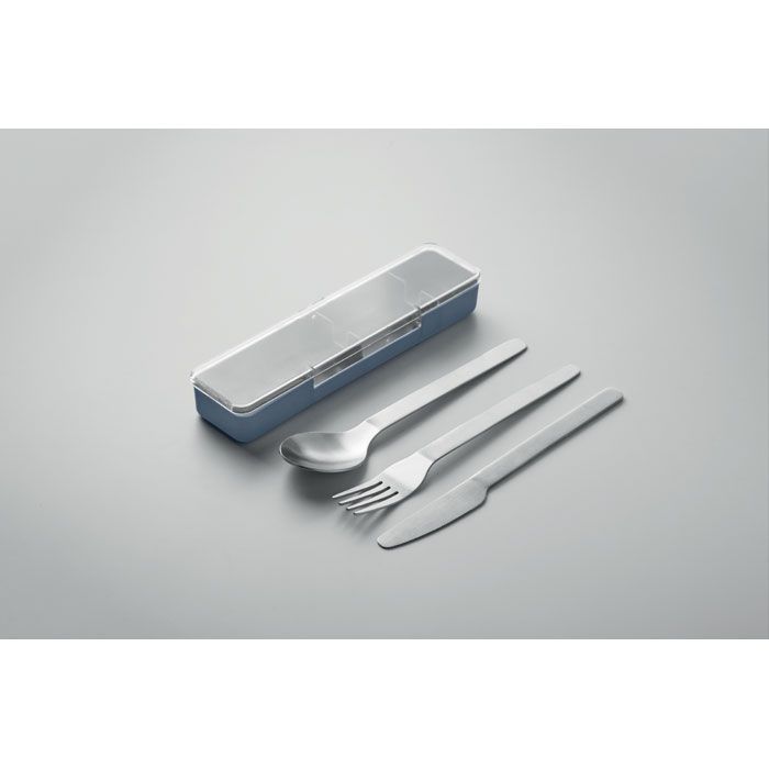 Sada příborů z nerezové oceli v pouzdru z PP. Obsahuje vidličku, nůž a lžíci.
