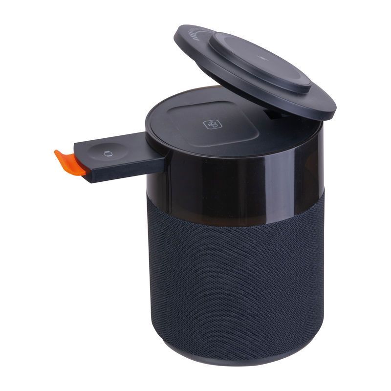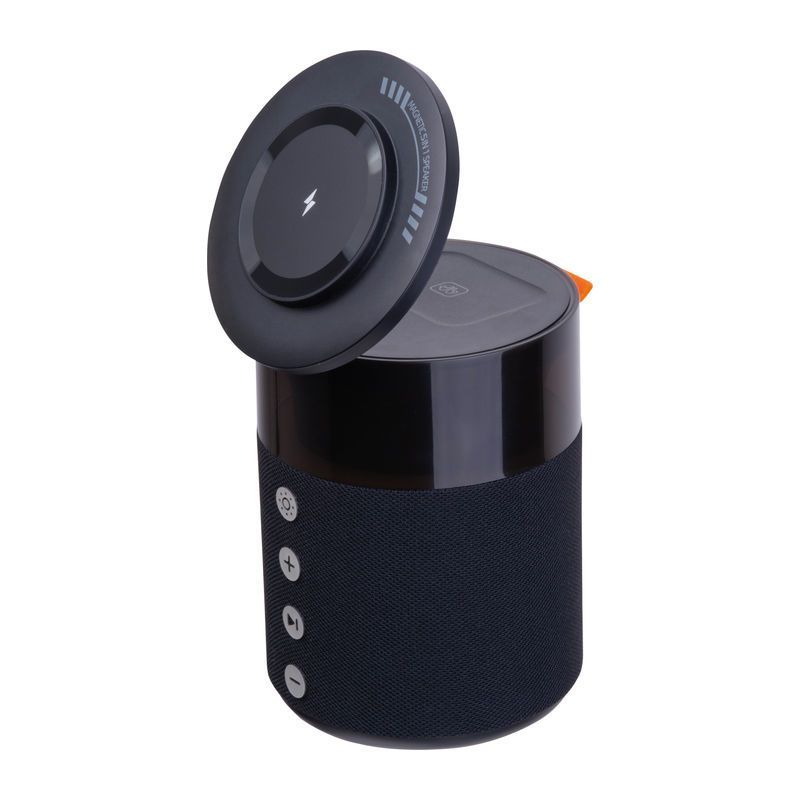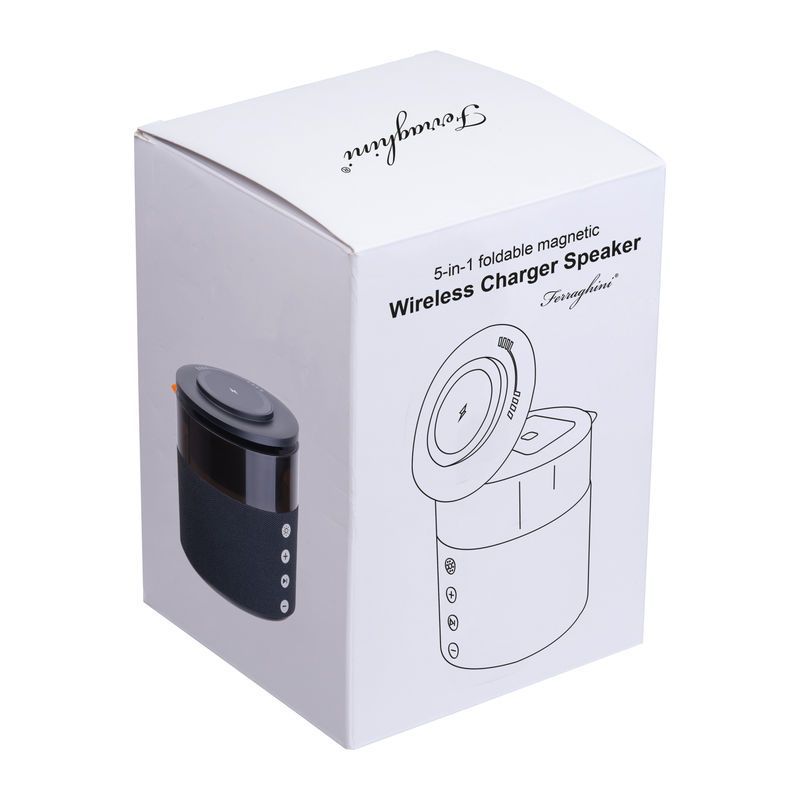 Reproduktor Ferraghini 5 v 1 s výkonom 5 W a rozhraním Bluetooth 5.4 s integrovanou bezdrôtovou nabíjačkou pre smartfón, AirPods slúchadlá a inteligentné Apple hodinky, dodávaný s káblom USB-C. Prevádzková doba 4 – 6 hodín, s batériou s kapacitou 1800 mAh. S LED osvetlením.