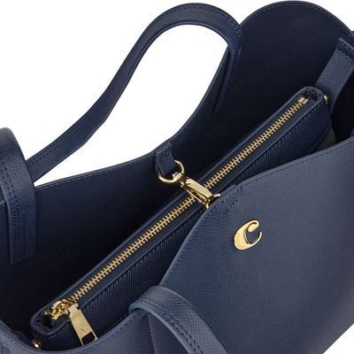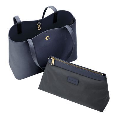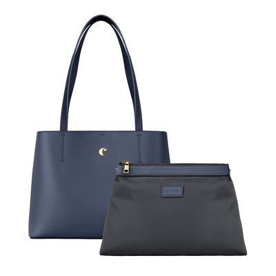 The Seraphine tote bag is a highly functional yet feminine piece, crafted from beautiful saffiano-textured vegan leather (PU) and offered in a playful palette of colors. It is signed with an oversized gold-toned C plate, adding a distinctive Cacharel touch. Designed as a 2-in-1 accessory, its spacious interior includes a large detachable pouch that can be used separately as a travel organizer. The tote closes with an elegant hook-and-ring system, bringing a subtle and unexpected twist to its design. Lightweight, easy to wear, and effortlessly versatile, it complements any outfit. Available in black, navy, taupe, yellow, and light grey.