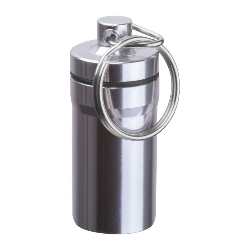 Prívesok na kľúče s vonkajším povrchom z nehrdzavejúcej ocele a vnútorným plastom. Ideálna na bezpečné uloženie malých predmetov na cesty.