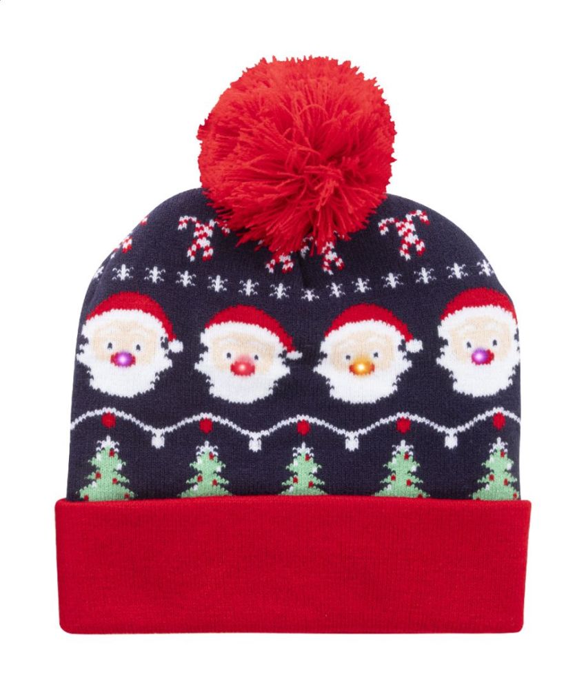 Pletená vianočná čiapka z akrylu so 6 LED svetlami (3 režimy svietenia), manžetou a brmbolcom. S gombíkovou batériou.