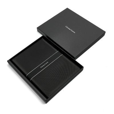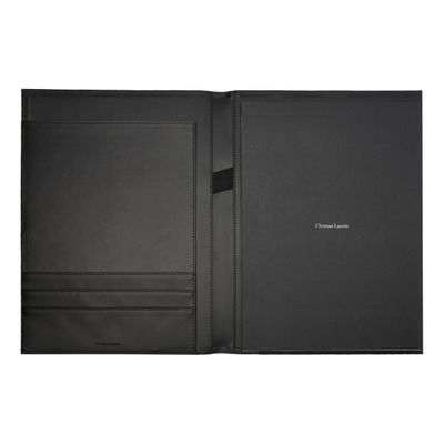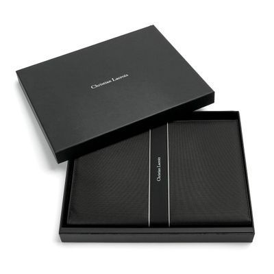 The "Caprio" Writing Folder: Ideal for creating sleek sets with pens, featuring a modern aesthetic. Diamond-like black texture, a matte logo band with two grey stripes for emphasis, and a matte TPU logo execution. Made of PU. Available in two sizes: A5 and A4.