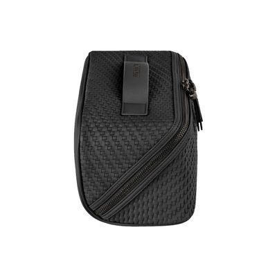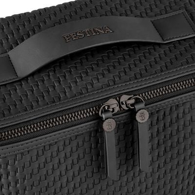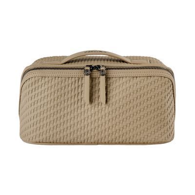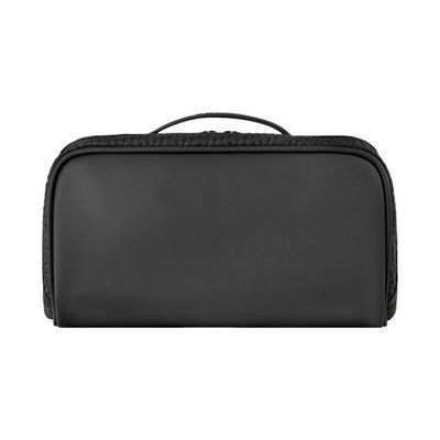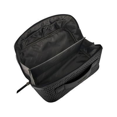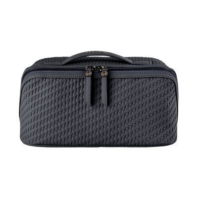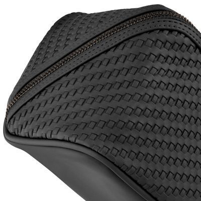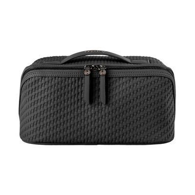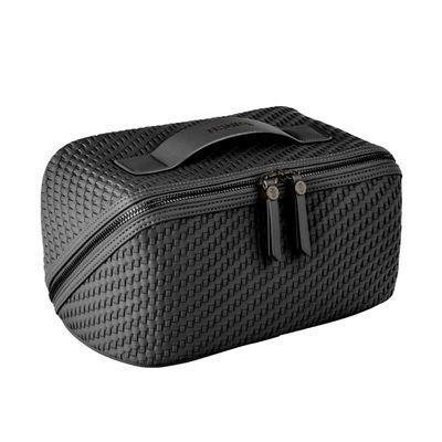 The Interlace cosmetic bag in black showcases the line’s woven-inspired texture, crafted to resemble meticulous braiding and finished in a smooth matte for a luxurious, contemporary feel. This distinctive surface shapes its visual identity with depth and sophistication, elevated by signed details including blazon-engraved zipper pullers. Its smart, distinctive construction opens wide to reveal a roamy interior equipped with a side elastic pouch for effortless organisation—an ideal companion for the organised and elegant traveller. Completed with sleek gun accents, it embodies refined modern elegance.