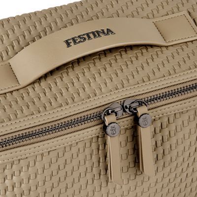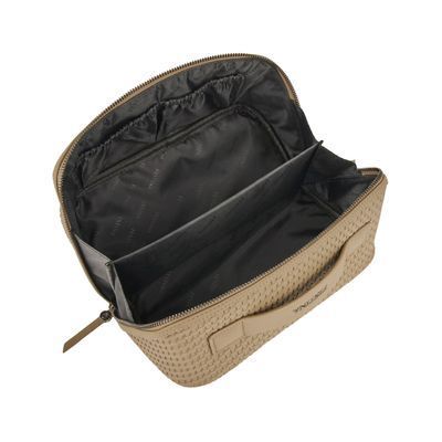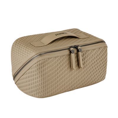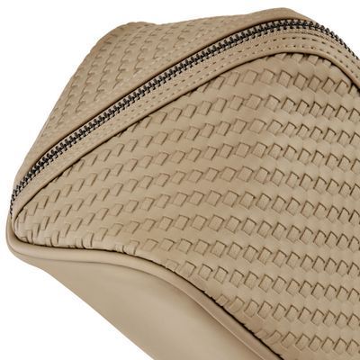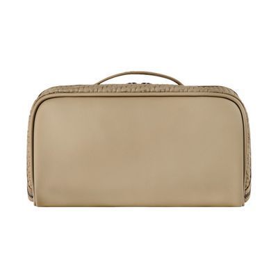 The Interlace cosmetic bag in taupe showcases the line’s woven-inspired texture, crafted to resemble meticulous braiding and finished in a smooth matte for a luxurious, contemporary feel. This distinctive surface shapes its visual identity with depth and sophistication, elevated by signed details including blazon-engraved zipper pullers. Its smart, distinctive construction opens wide to reveal a roamy interior equipped with a side elastic pouch for effortless organisation—an ideal companion for the organised and elegant traveller. Completed with sleek gun accents, it embodies refined modern elegance.