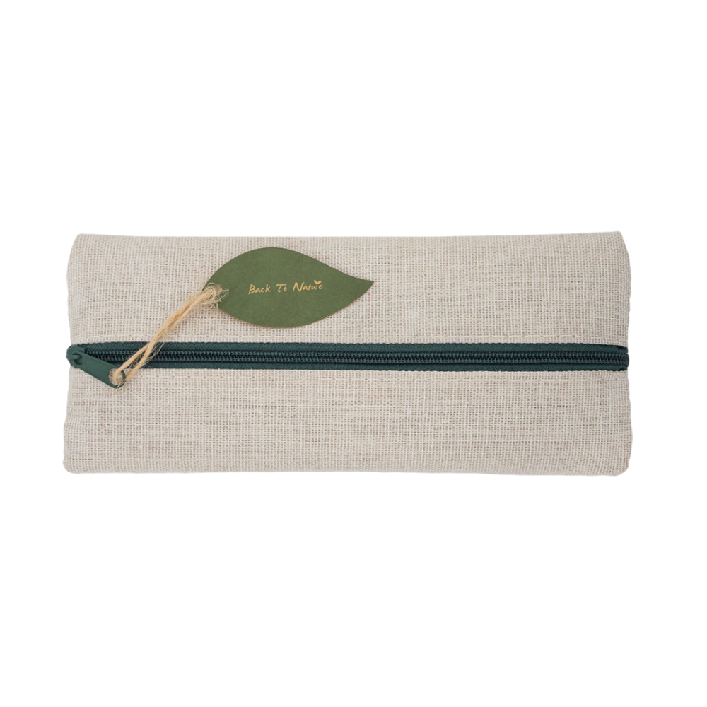 Sada psacích potřeb v pouzdru z juty se zipem. Skládá se z pera s modrou náplní, tužky, pravítka (15 cm), gumy a ořezávátka. Vše vyrobeno z přírodních materiálů.