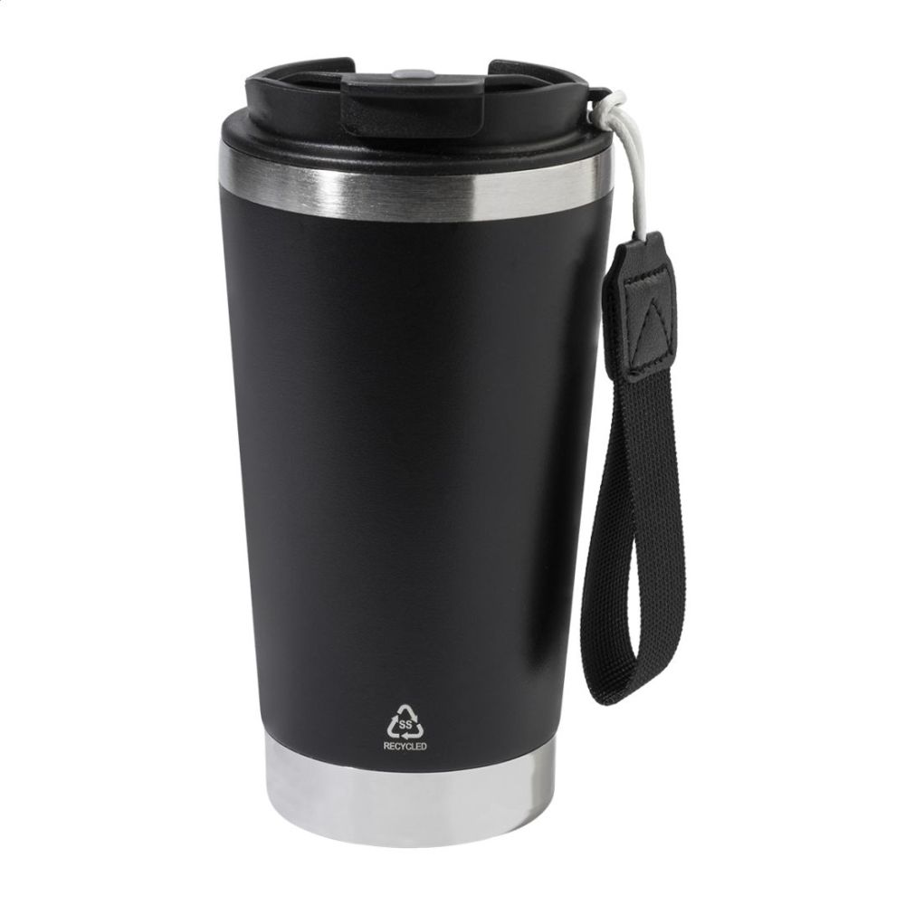 Dvojstenný termo hrnček z recyklovanej nerezovej ocele s viečkom na pitie z PP a popruhom na prenášanie v zodpovedajúcej farbe. 430 ml.