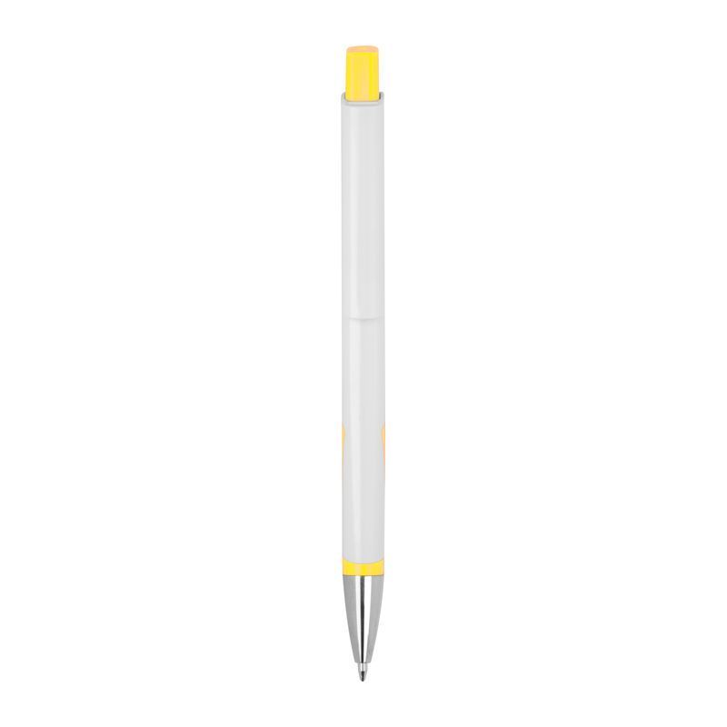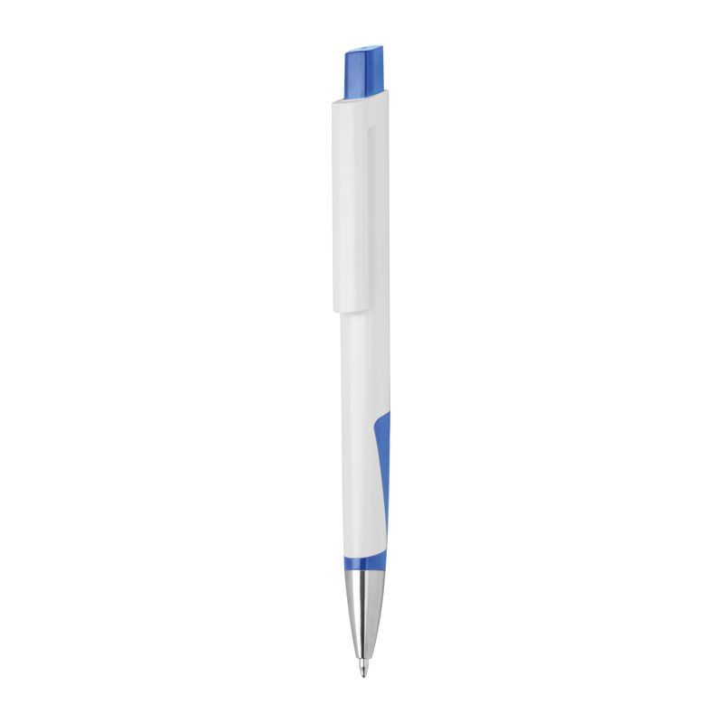 Biele guľôčkové pero z recyklovaného plastu (RABS) s modrou náplňou.