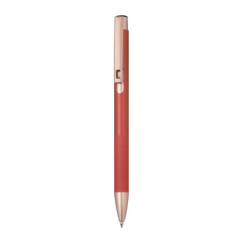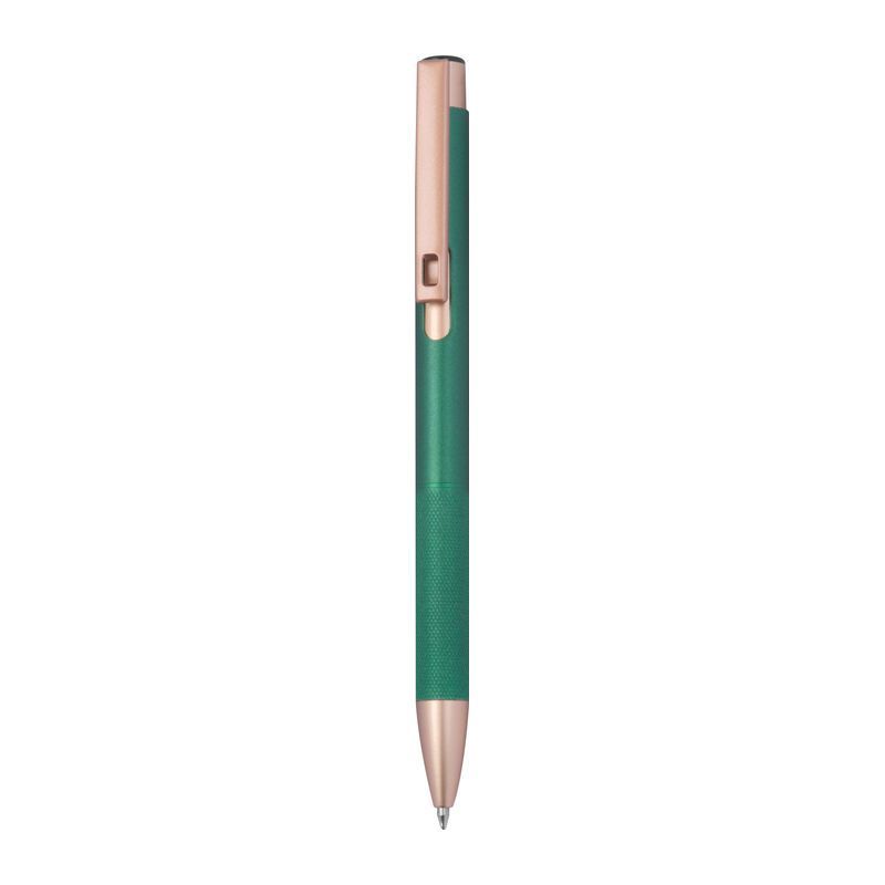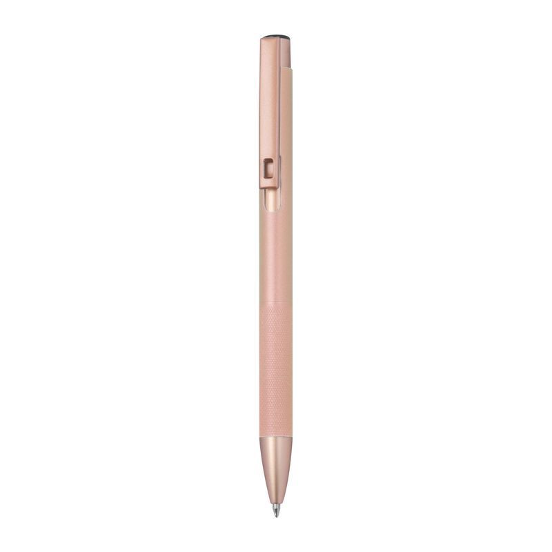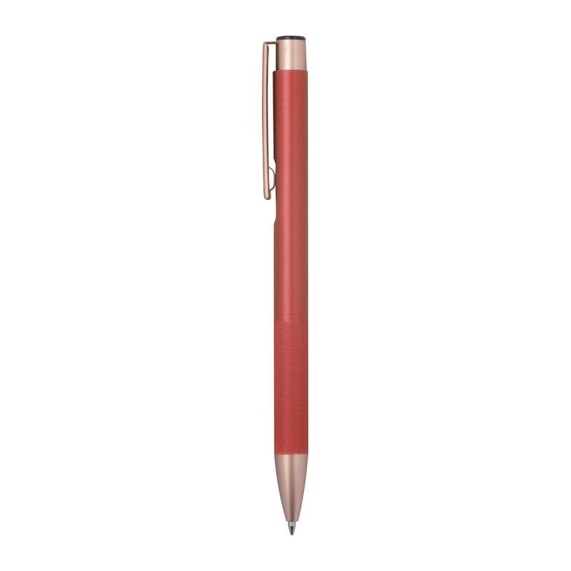 Guľôčkové pero z recyklovaného hliníka s matným povrchom, ružovo-zlatými detailmi, modrou náplňou a úchopom s diamantovým vzorom