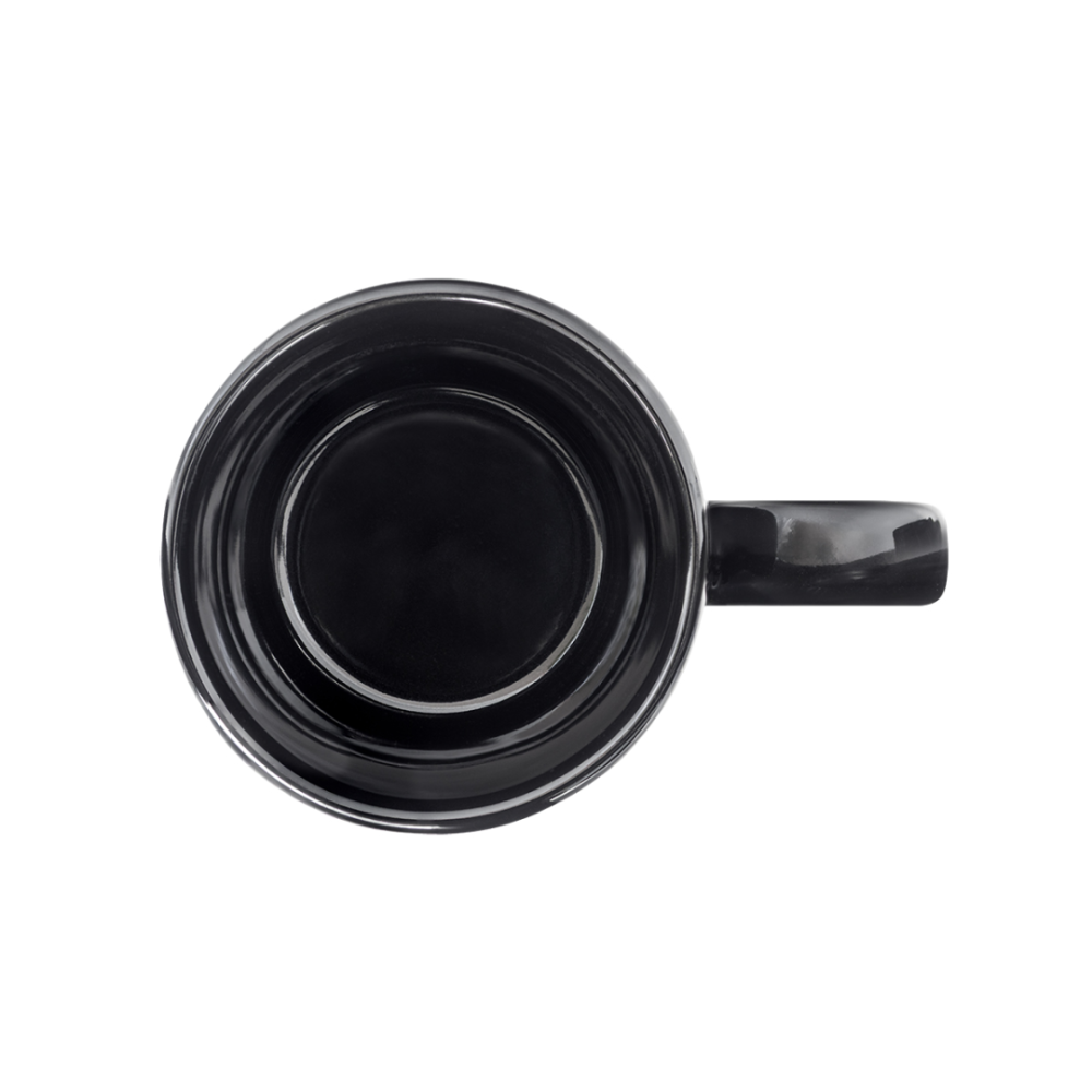 Stylový keramický hrnek o objemu 480 ml s lesklým povrchem, ergonomickým ouškem a kovovým plíškem v barvě gun metal pro gravírování loga. Jen ruční mytí.