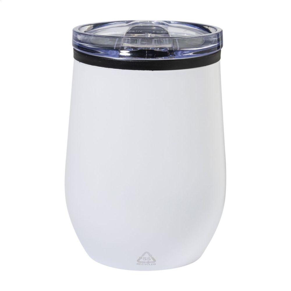 Dvojstenný termo hrnček z recyklovanej nerezovej ocele s vnútornou stranou z PP a viečkom z PS. 350 ml.