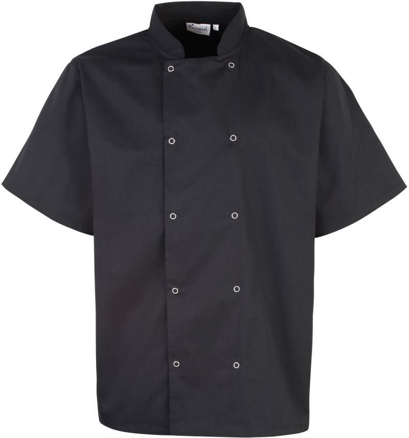 Unisex, mandarín límeček, překrývající se zapínání na 10 patentek, pratelné na 60°, průmyslové praní pratelné na 85°, lze sušit v sušičce při nízké teplotě