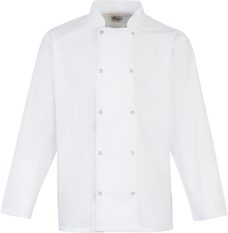 Unisex, mandarín límeček, překrývající se zapínání na 10 patentek, pratelné na 60°, průmyslové praní pratelné na 85°, lze sušit v sušičce při nízké teplotě
